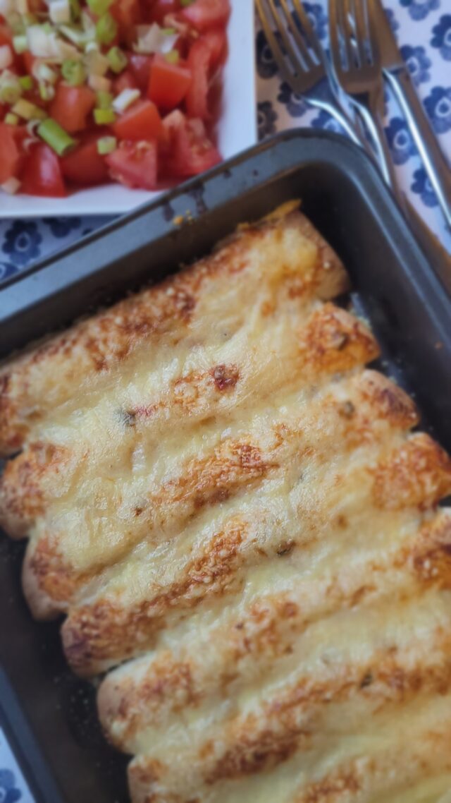 - Grädda enchiladas mitt i ugnen i cirka 10-15 minuter. De ska få en gyllengul färg och osten ska ha smält.