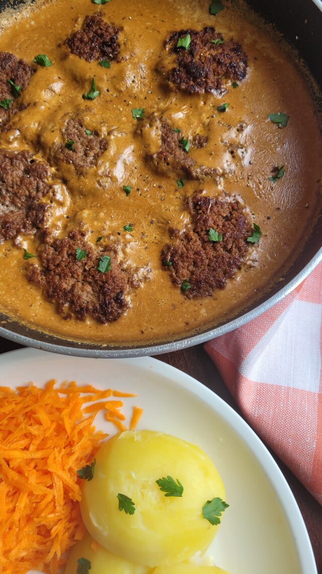 / 2025/10/03Det bästa med köttfärs är att man kan göra så mycket med det och variera smakerna i nästan det oändliga. Istället för att göra vanliga köttfärsbiffar så har jag smaksatt dem med lite chilisås. Jag har dessutom kryddat gräddsåsen lite extra med fem sorter peppar. Santa Maria har en kryddkvarn med fem sorters peppar i, men annars går det bra med bara svartpeppar också. Låt biffarna puttra med i såsen på slutet i några minuter så blir det riktigt fina. Ursprungligen så var det 5 dl grädde i receptet men för att få ner pointsvärdet så har jag bytt ut en del mot mjölk istället. Du som inte följer Viktväktarnas program kan göra som du vill, ha bara grädde eller med mjölk, men mycket sås ska det vara.