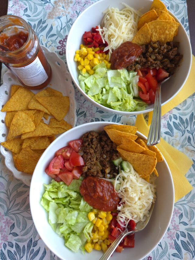 / 2026/04/10Jag är så förtjust i Bowls och det här är ett resultat av mina olika försök av skapa så goda bowls som möjligt. Det här blev verkligen så gott. Knepet är att krossa tortilla chipsen och sedan blanda allt väl. Använd detta recept som en grund och lägg till olika godsaker som du brukar ha när du äter tacos där hemma hos dig.